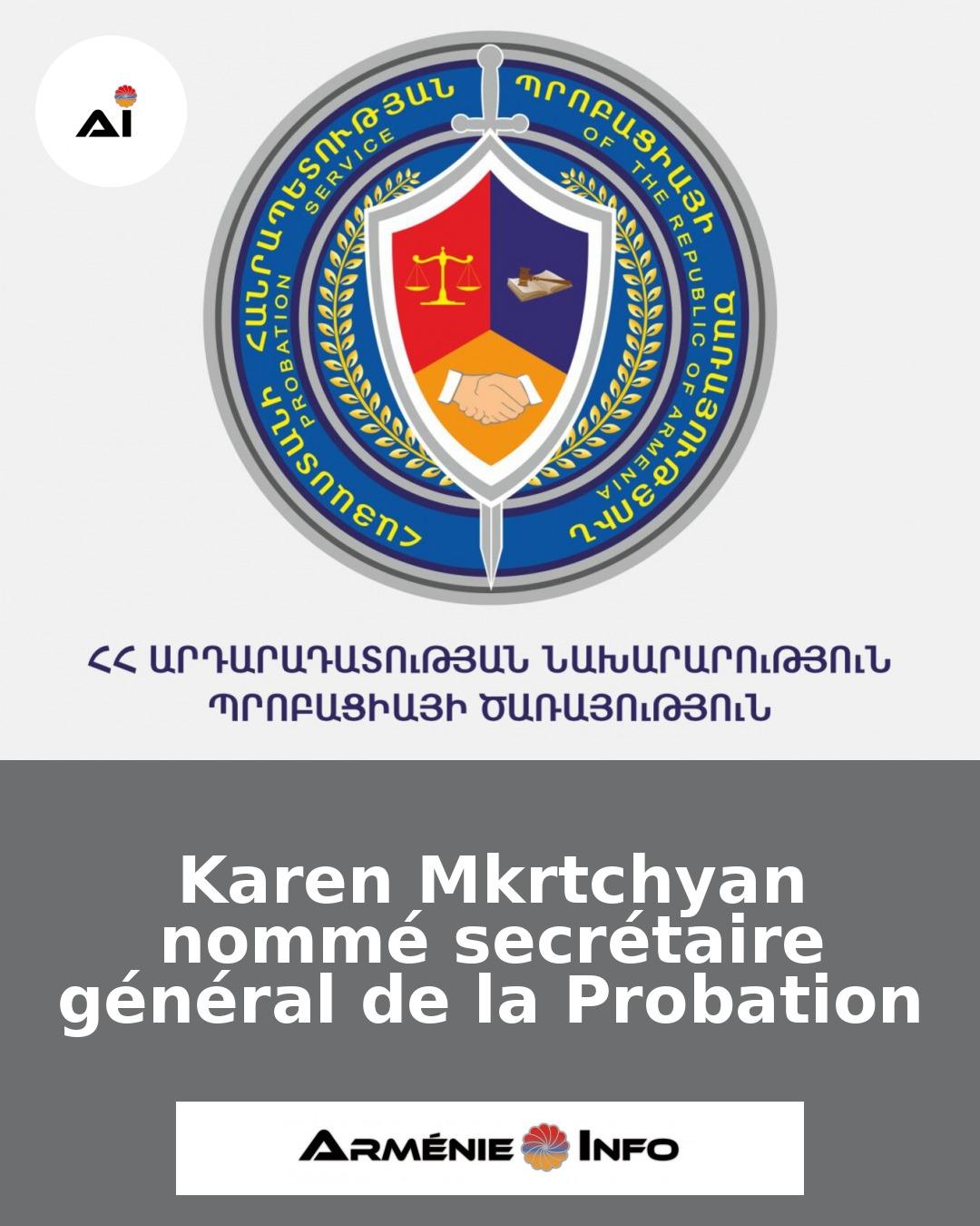 Karen Mkrtchyan a été nommé secrétaire général du Service de probation d'Arménie, selon une annonce officielle. Cette nomination marque une étape importante dans la gestion des services de probation du pays.