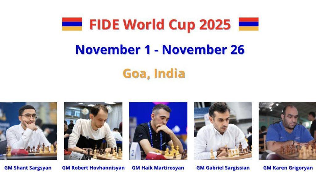 Les grands maîtres arméniens Shant Sarkisyan, Robert Hovhannisyan, Haik Martirosyan, Gabriel Sargsyan et Karen Grigoryan participeront à la Coupe du Monde FIDE 2025, qui se déroulera du 1er au 26 novembre dans l’État de Goa, en Inde, selon la Fédération arménienne des échecs.